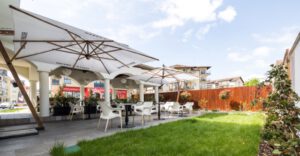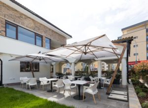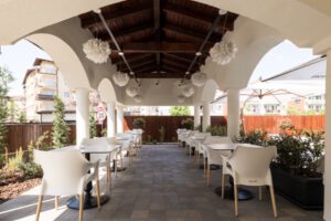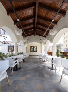 Outside, the main covered terrace exudes an elegant atmosphere, adorned with lights reminiscent of those in the main hall. On both sides of the terrace, there are exits leading to the garden, where tables and chairs are set under white fabric umbrellas, complementing the idyllic atmosphere of the confectionery.