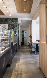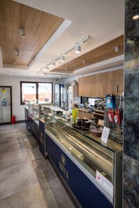 Our approach involved harmoniously integrating lighting solutions with the confectionery’s natural theme. The wooden accents behind the counter blend seamlessly with the natural space, while the white track lighting illuminates the area around the counter.