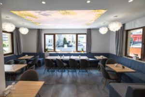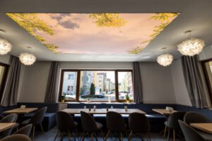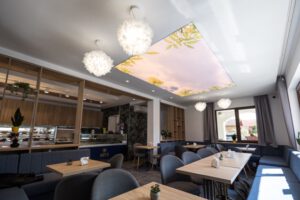 The main seating area exudes coziness with soft sofas and tables accompanied by chairs. The ceiling, stretched like a park sky, induces a feeling of relaxation and calmness. Hanging along the edges of this ceiling are pendant lamps, adding charm reminiscent of leaves.