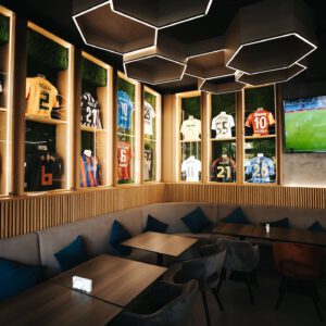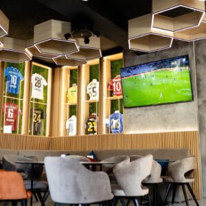 Large wooden LED lamps in the shape of hexagons above the seating area and the illuminated display case with football jerseys are just some of our solutions that add elegance and a distinctive character to the themed bar interior.